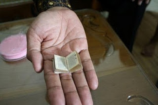 Al-quran mini dengan panjang 2,5 cm, lebar 1,8 cm, dan tebal 1 cm miliknya di Rembang, Kecamatan Rembang, Kabupaten Pasuruan